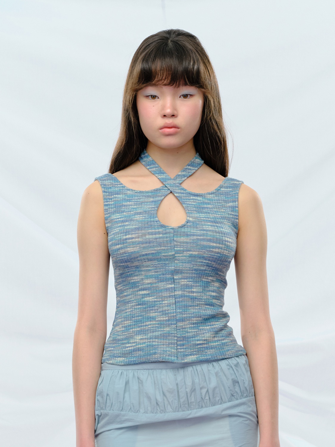 가슴 오프닝에서 이어져 목 뒤로 묶는 연장 스트랩 디테일